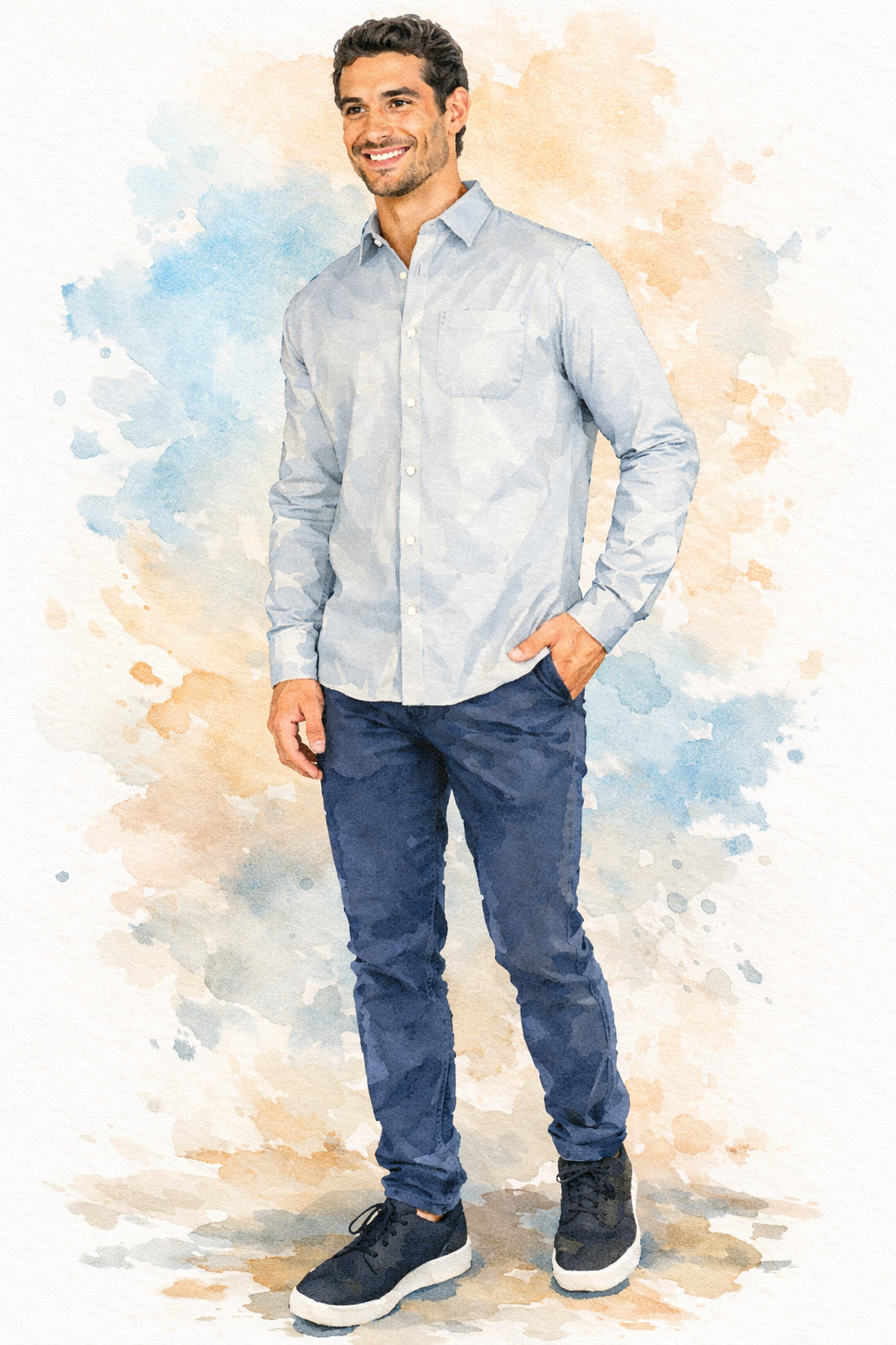 Para o casamento ao ar livre, sugerimos traje "Esporte Fino". Camisa social com calça de alfaiataria é uma ótima escolha, ou um terno leve, caso prefira algo mais formal.